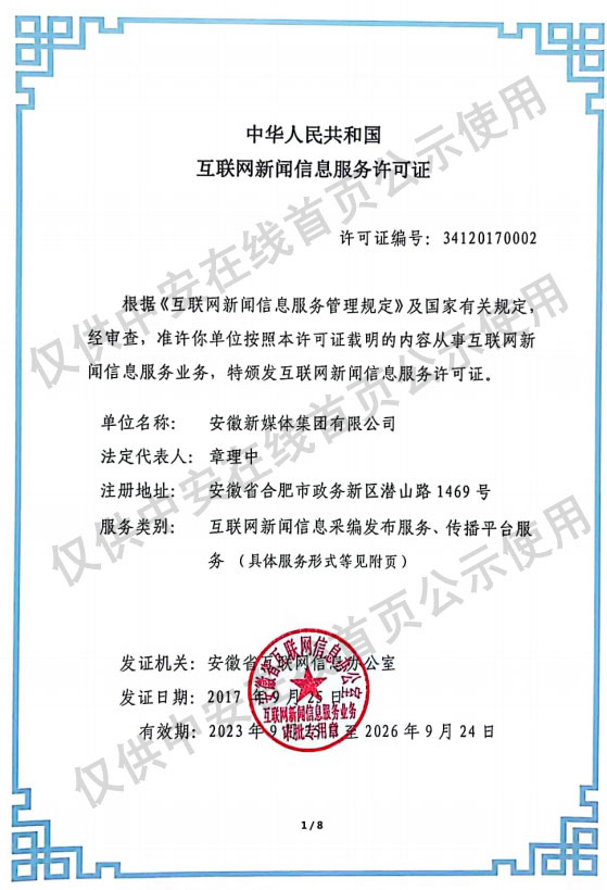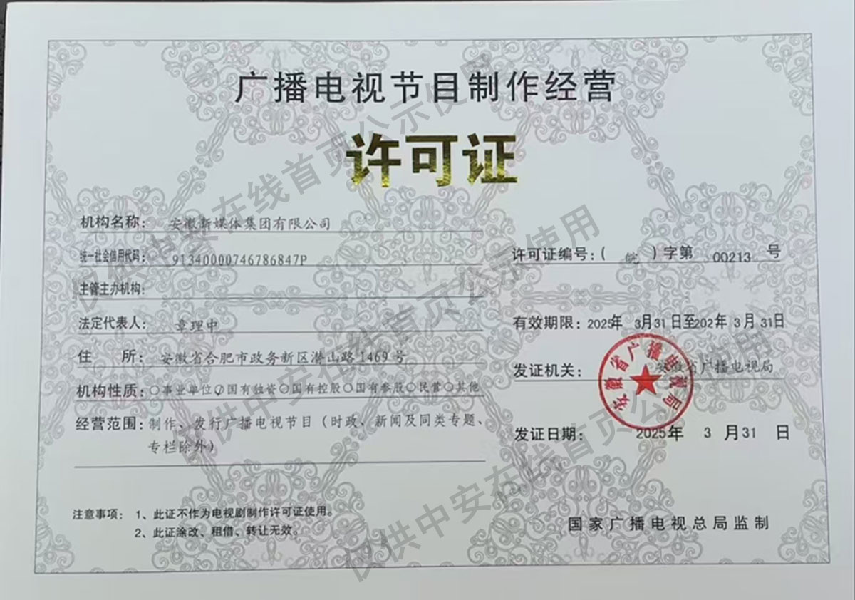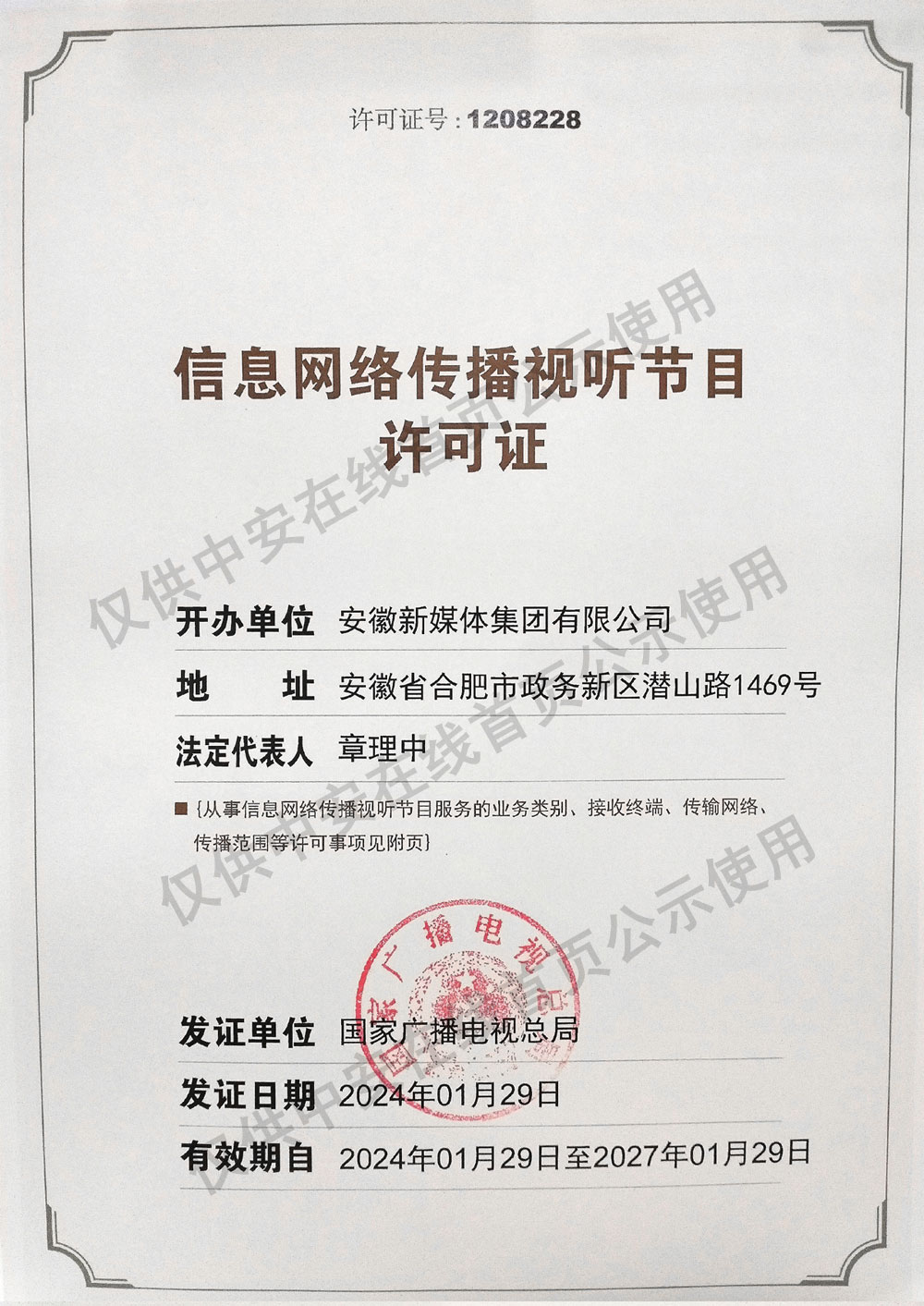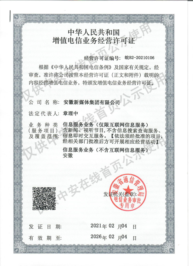 互聯(lián)網(wǎng)新聞信息服務(wù)許可證34120170002 增值電信業(yè)務(wù)經(jīng)營許可證皖B2-20210106 廣播電視節(jié)目制作經(jīng)營許可證皖字第00213號 信息網(wǎng)絡(luò)傳播視聽節(jié)目許可證1208228 皖I(lǐng)CP證皖B2-20080023-7 皖公網(wǎng)安備34010002000033號